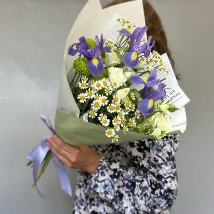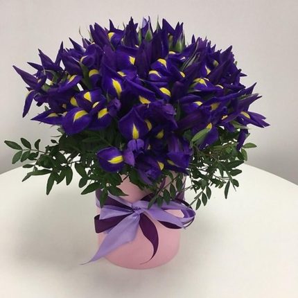 Корзина с розами, ирисами, кустовой хризантемой, альстромерией и лимониумом “Виноградная лоза”