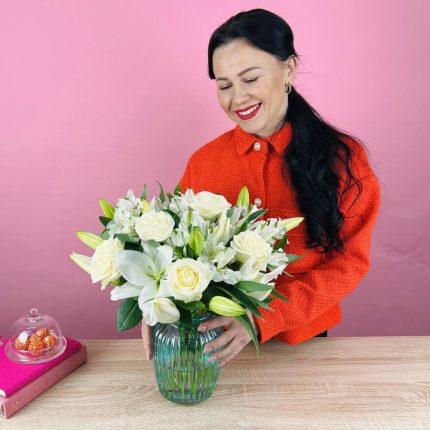 Шляпная коробка с пионовидными лилиями, розами и голубым оксипеталумом