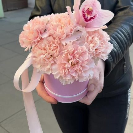 НЮ премиум мини-композиция из экзотической орхидеи и диантусов в шляпной коробке