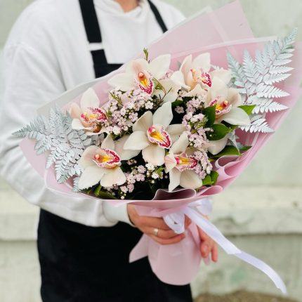 Авторский букет: орхидея розовая, диантус персиковый и роза розовая Маритим