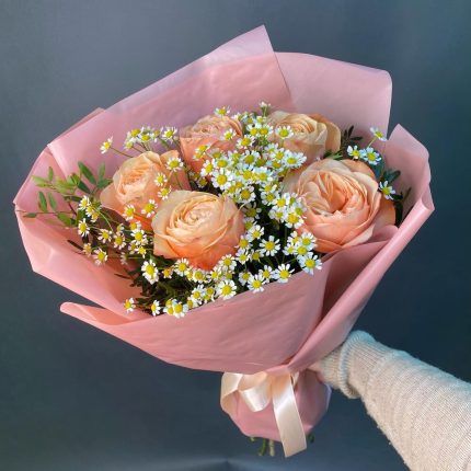 Солнце в руках, букет с ранункулюсами, ромашками и пионовидными розами