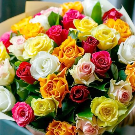 Яркий комплимент: яркие цветы в сумочке (лизиантус, красная роза, пионовидная кустовая роза”
