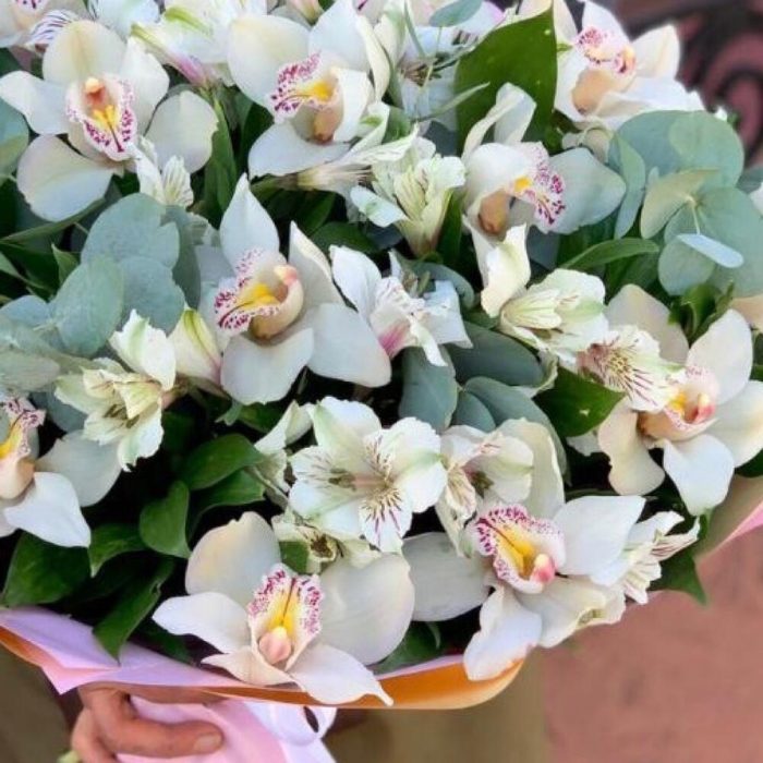 Орхидея Цимбидиум ветка – 1 шт.Альстромерия – 7 шт.Эвкалипт – 5 шт.Зелень – 15 шт.Упаковка дизайнерская – 3 шт.