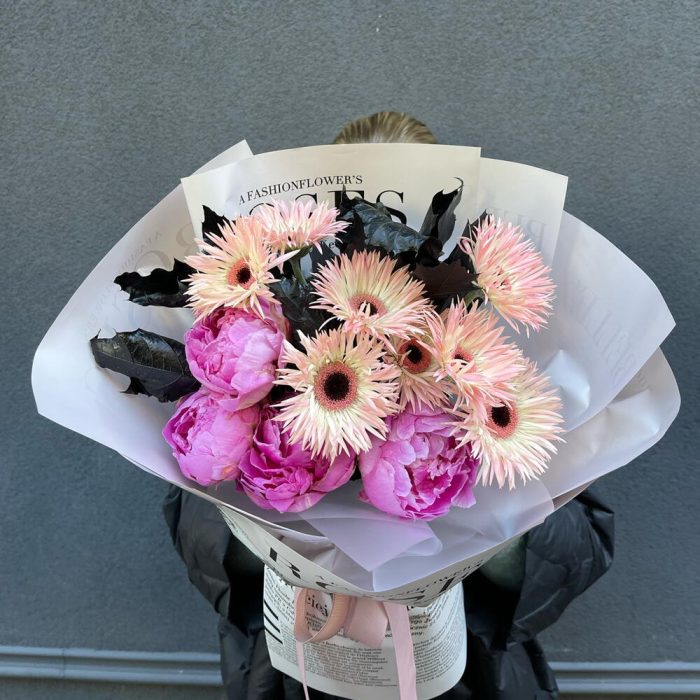гербера рожева – 8 шт. півонія – 4 шт. листя фарбоване – 2 шт.