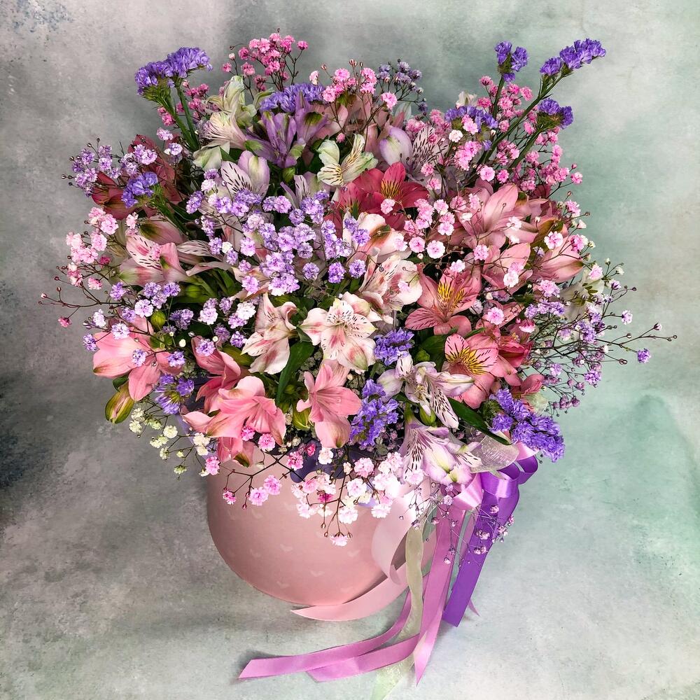 Альстромерия – 18 шт.гипсофила радужная – 6 шт.Статица – 2 шт.Коробка шляпная – 1 шт.Оазис флористический – 2 шт.ленты атласные – 4 шт.