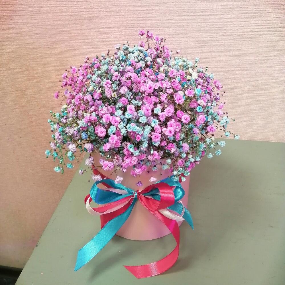Коробка шляпная – 1 шт.Оазис флористический – 1 шт.гипсофила радужная – 6 шт.