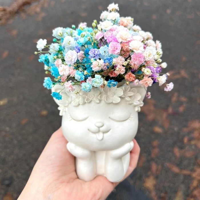Открыточка с вашими пожеланиями – 1 шт. гипсофила радужная – 1 шт. кашпо из гипса ручной работы – 1 шт.
