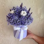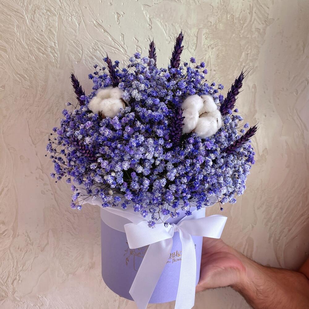 Гипсофила – 7 шт. Хлопок – 3 шт. Коробка шляпная – 1 шт. Пшеница – 11 шт. Оазис флористический – 1 шт.