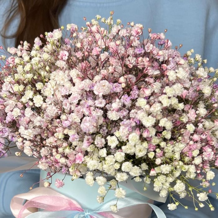 “Сиреневый туман” – композиция из гипсофилы в шляпной коробке