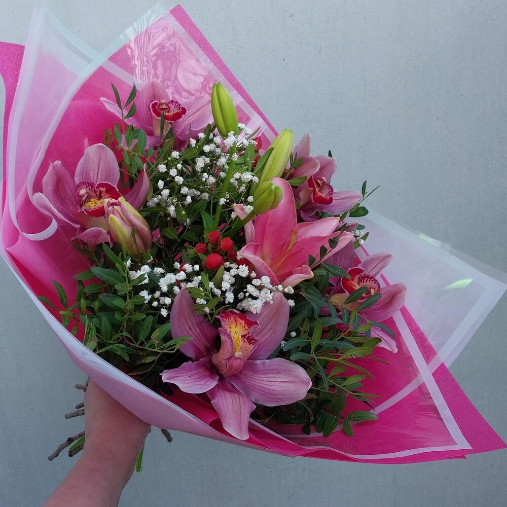 Гипсофила – 1 шт.Упаковка дизайнерская – 3 шт.Орхидея Цимбидиум розовый – 5 шт.Хиперикум красный – 2 шт.фисташка зелень – 10 шт.лилия розовая азиатская – 1 шт.