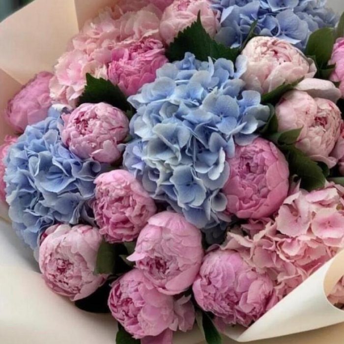 Пион розовый – 20 шт.Гортензия микс – 5 шт.Упаковка дизайнерская – 1 шт.Лента атласная – 2 шт.Открыточка с вашими пожеланиями – 1 шт.хорошее настроение – 100 шт.инструкция по уходу за цветами – 1 шт.коробка переноска – 1 шт.Кризал – 1 шт.