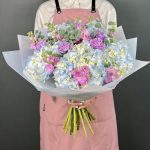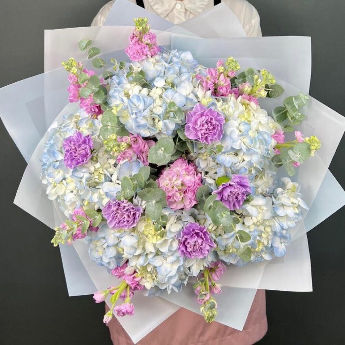 Гортензия – 5 шт.Маттиола – 10 шт.Эвкалипт – 5 шт.Диантус – 5 шт.