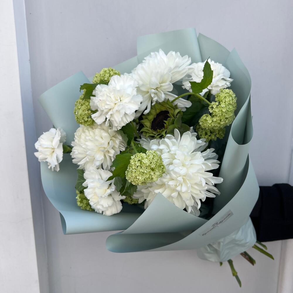 Хризантема Антонов – 3 шт.Вибурнум – 2 шт.Подсолнух – 1 шт.Диантус – 4 шт.Пленка дизайнерская – 1 шт.Лента – 1 шт.