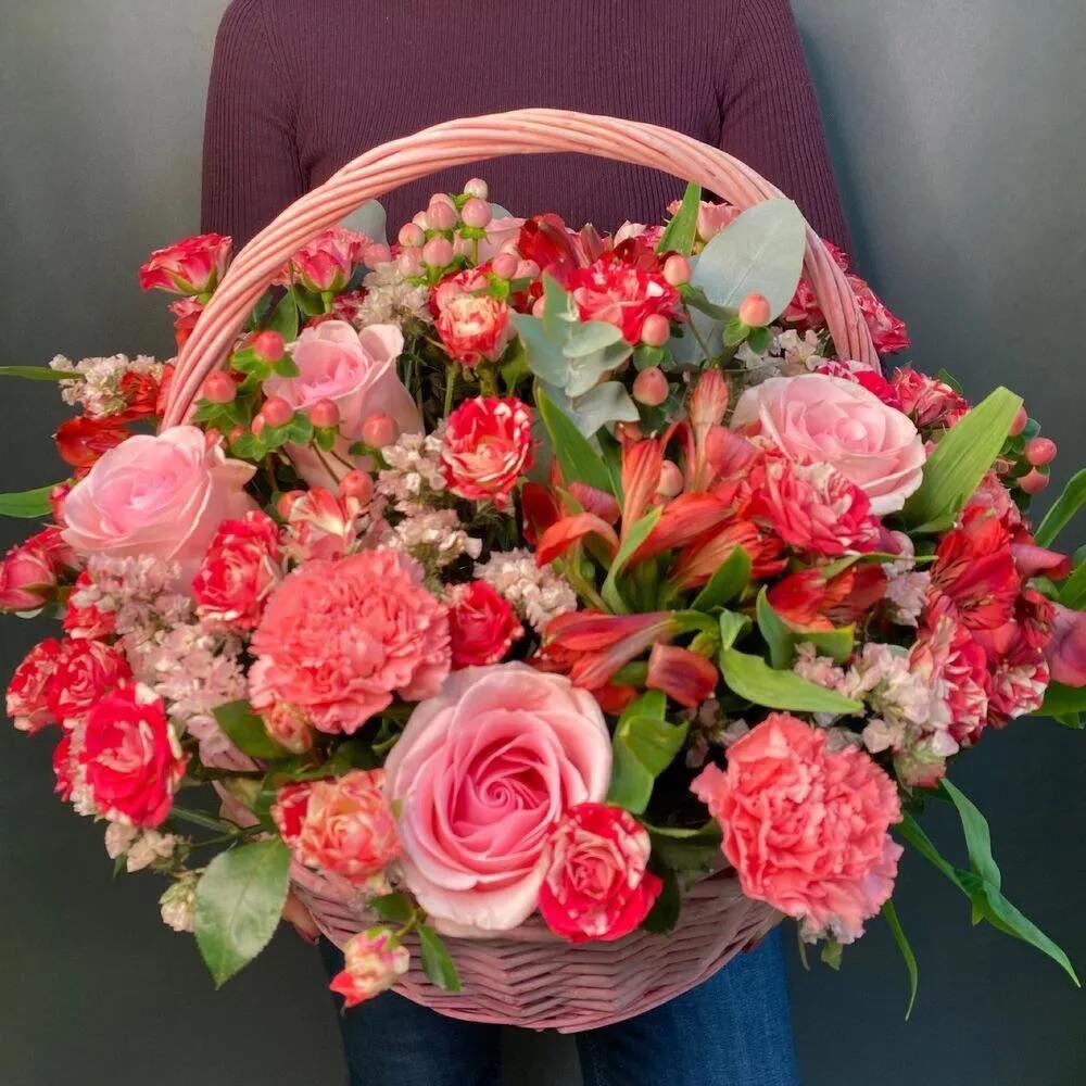 Гиперикум – 3 шт.Роза кустовая – 5 шт.Статица – 4 шт.Роза Эквадор – 9 шт.Корзина плетеная ива – 1 шт.Альстромерия Микс Европа – 7 шт.Оазис флористический – 1 шт.зелень декоративная – 5 шт.Диантус сортовой – 5 шт.