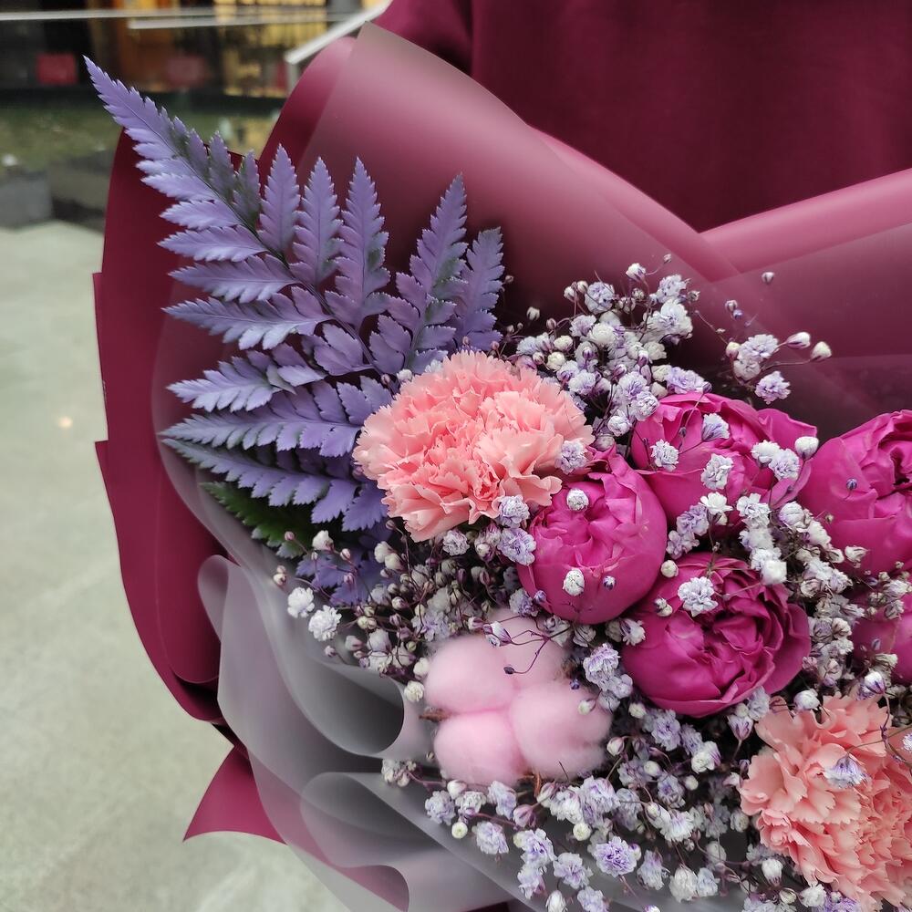 Гвоздика сортовая – 3 шт.Misty bubbles – 1 шт.Гипсофила – 1 шт.Хлопок натуральный – 1 шт.папоротник ветка – 1 шт.