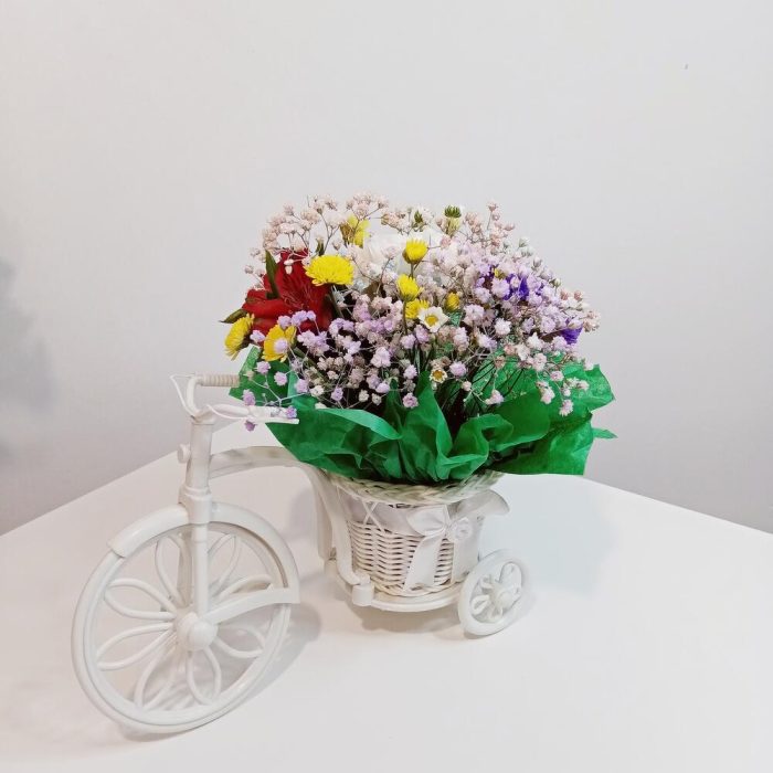 Диантус – 1 шт.альстромерия микс – 2 шт.гипсофила микс – 1 шт.Хризантема кустовая Сантини – 1 шт.Статица – 1 шт.Флористический оазис – 1 шт.Велосипед – 1 шт.
