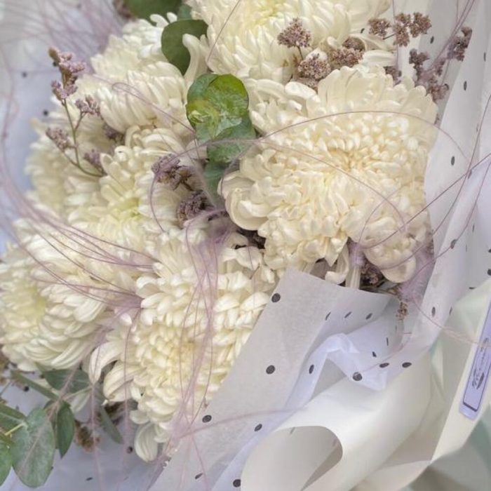 Лимониум – 1 шт.Эвкалипт – 1 шт.Хризантема – 7 шт.Упаковка дизайнерская – 2 шт.Ковыль – 1 шт.