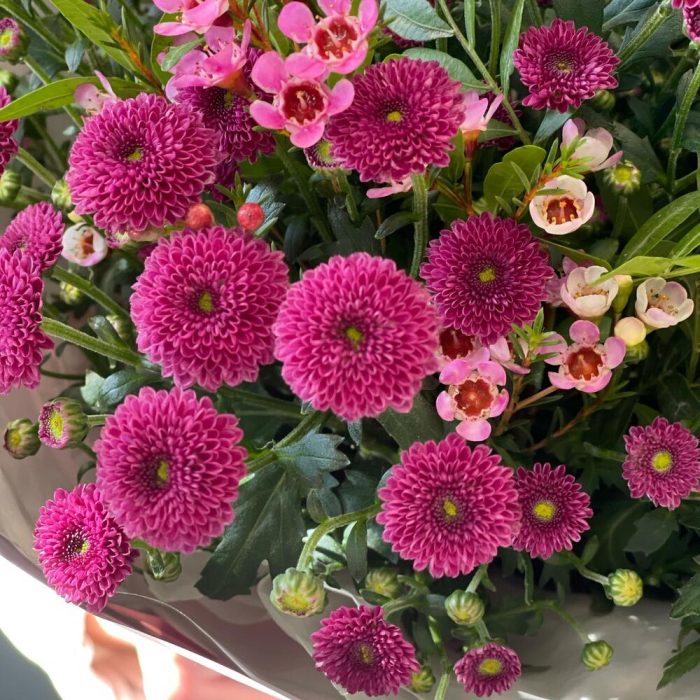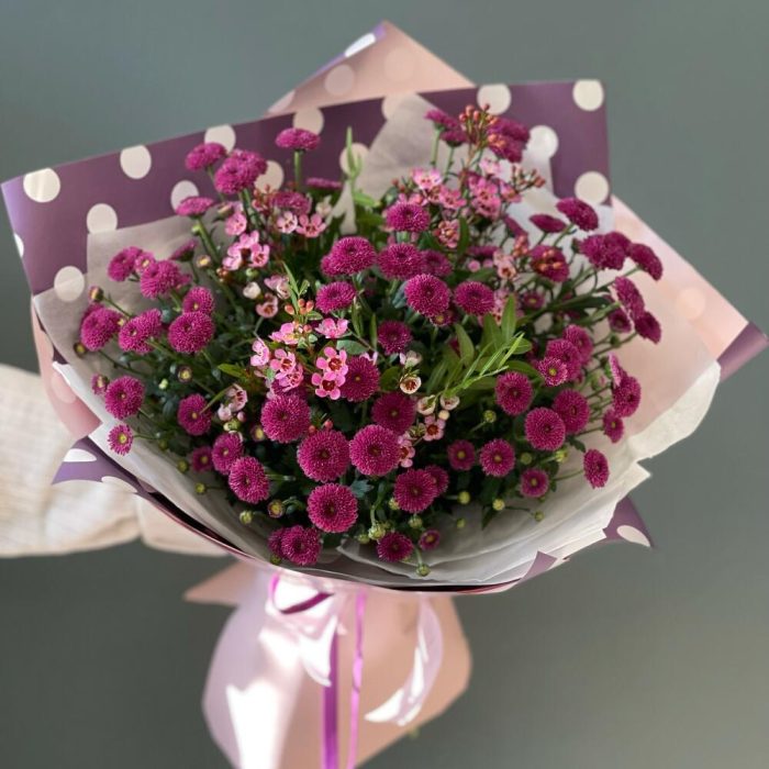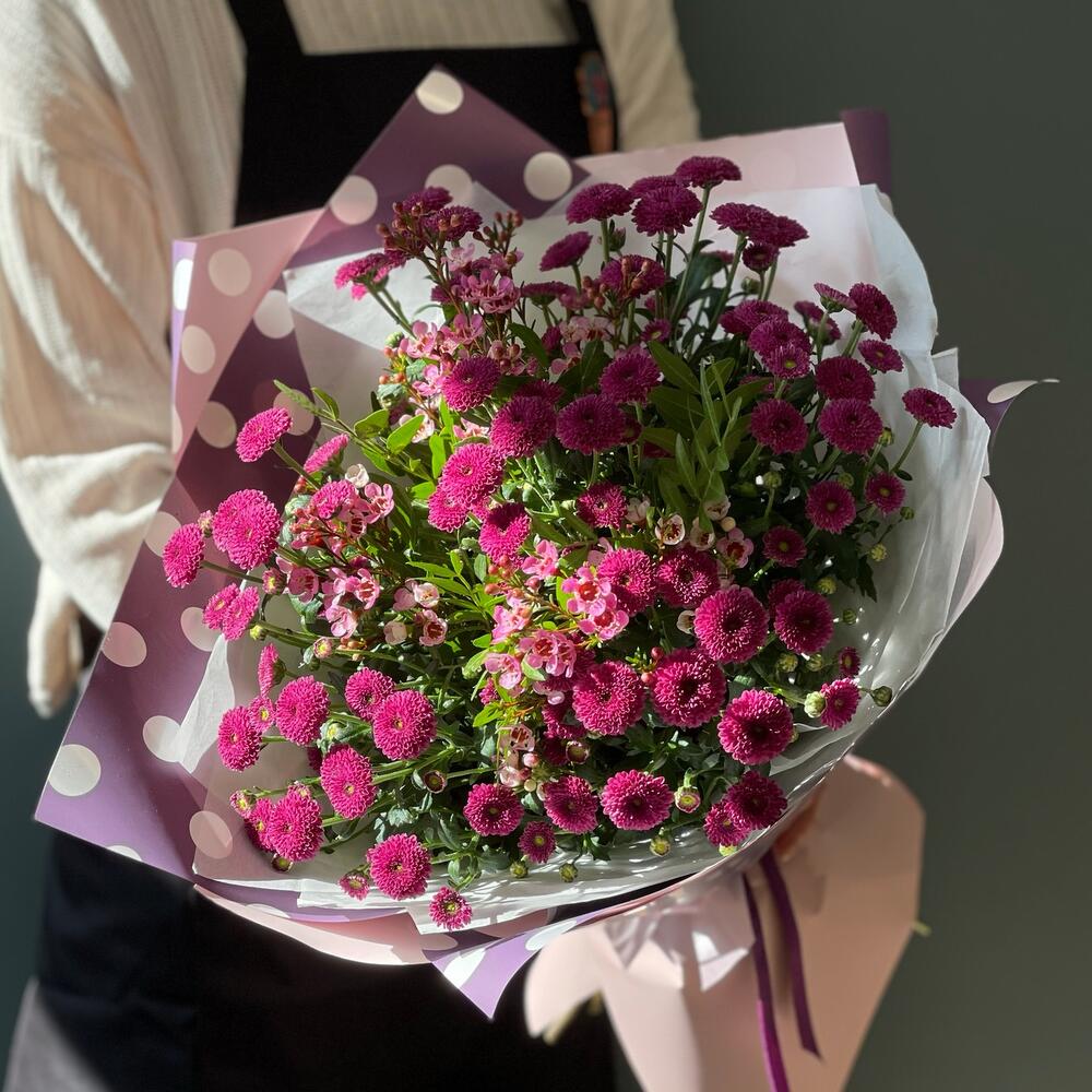 Ваксфлауэр – 3 шт.Лента – 1 шт.Хризантема Сантини – 7 шт.Фисташка – 3 шт.Упаковка дизайнерская – 1 шт.