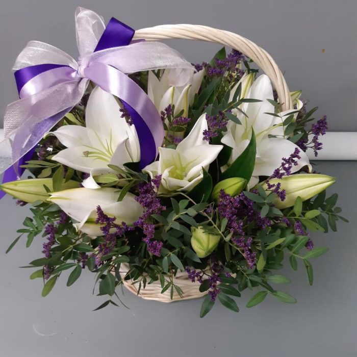 Лилия – 3 шт.Лимониум сиреневый – 3 шт.Фисташка – 5 шт.Эвкалипт – 6 шт.Корзина плетеная – 1 шт.Оазис флористический – 1 шт.Лента атласная – 2 шт.органза лента – 1 шт.
