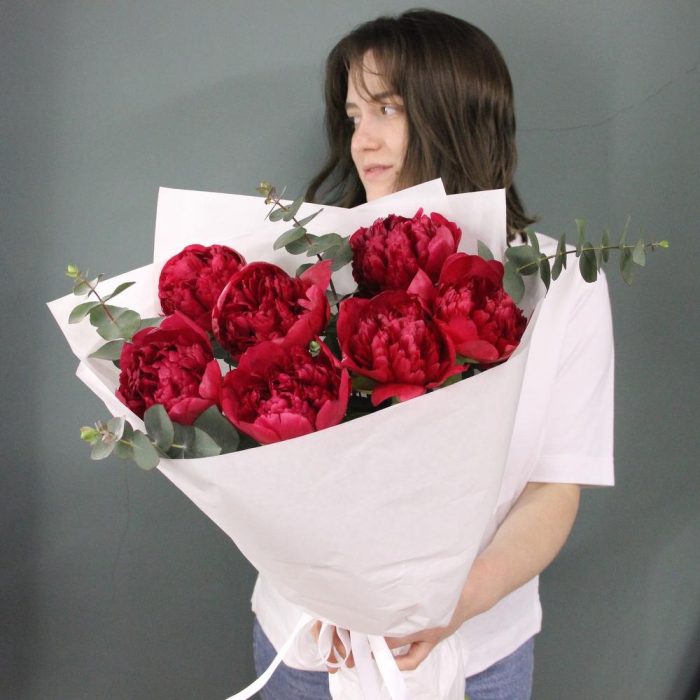 Пион – 7 шт.Эвкалипт – 4 шт.Лента атласная – 1 шт.Бумага – 2 шт.