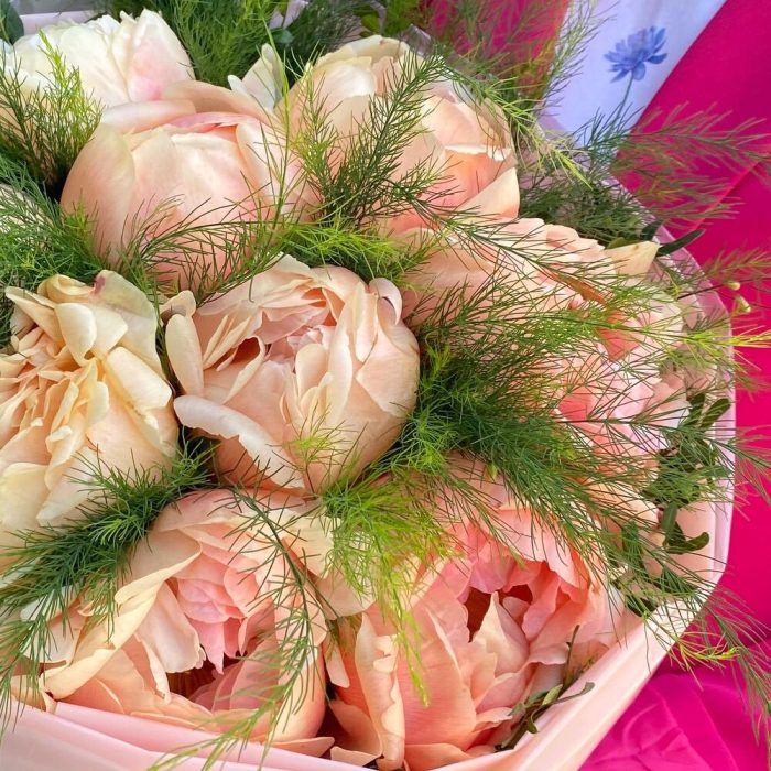 Лента атласная – 1 шт.Упаковка дизайнерская – 2 шт.зелень декоративная пучок – 1 шт.пионы крем ( италия) – 9 шт.