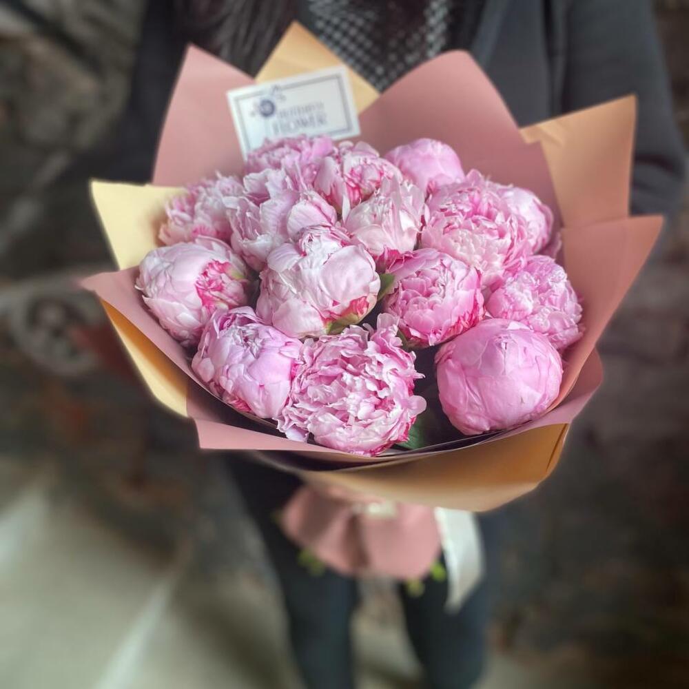 Букет из 15 розовых пионов в дизайнерской упаковке “Принцесса Маргарита”