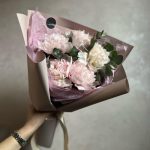 Атласная лента – 1 шт.декоративная упаковка – 1 шт.пионы – 5 шт.Эвкалипт – 3 шт.