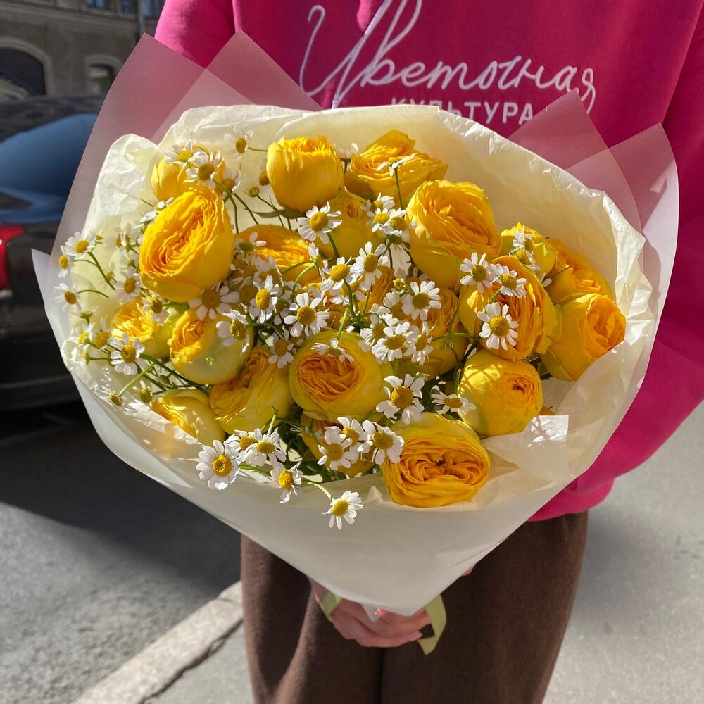 Букет солнечных роз с ромашкой
