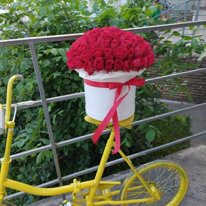Роза Эквадор – 101 шт.Коробка шляпная большая – 1 шт.Оазис флористический – 1 шт.бант атласный – 1 шт.