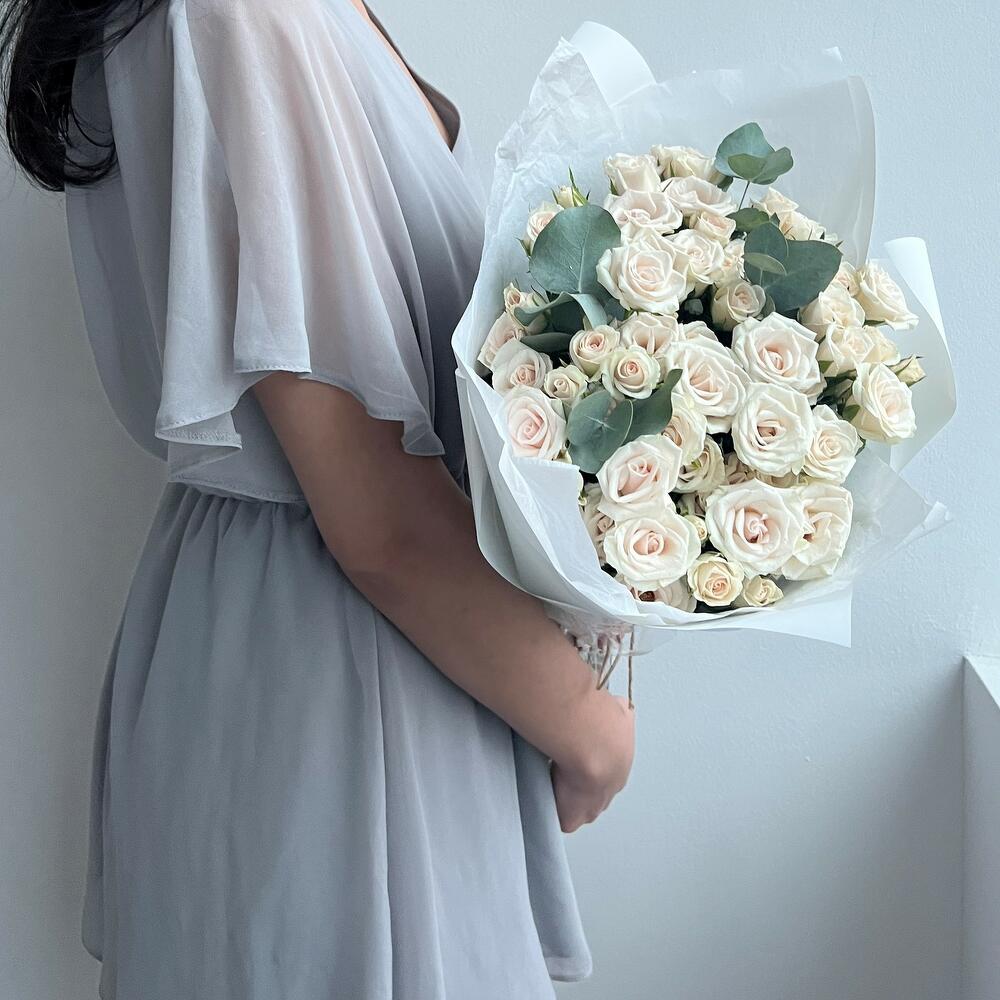 Роза кустовая – 15 шт.Эвкалипт – 3 шт.Упаковка дизайнерская – 2 шт.