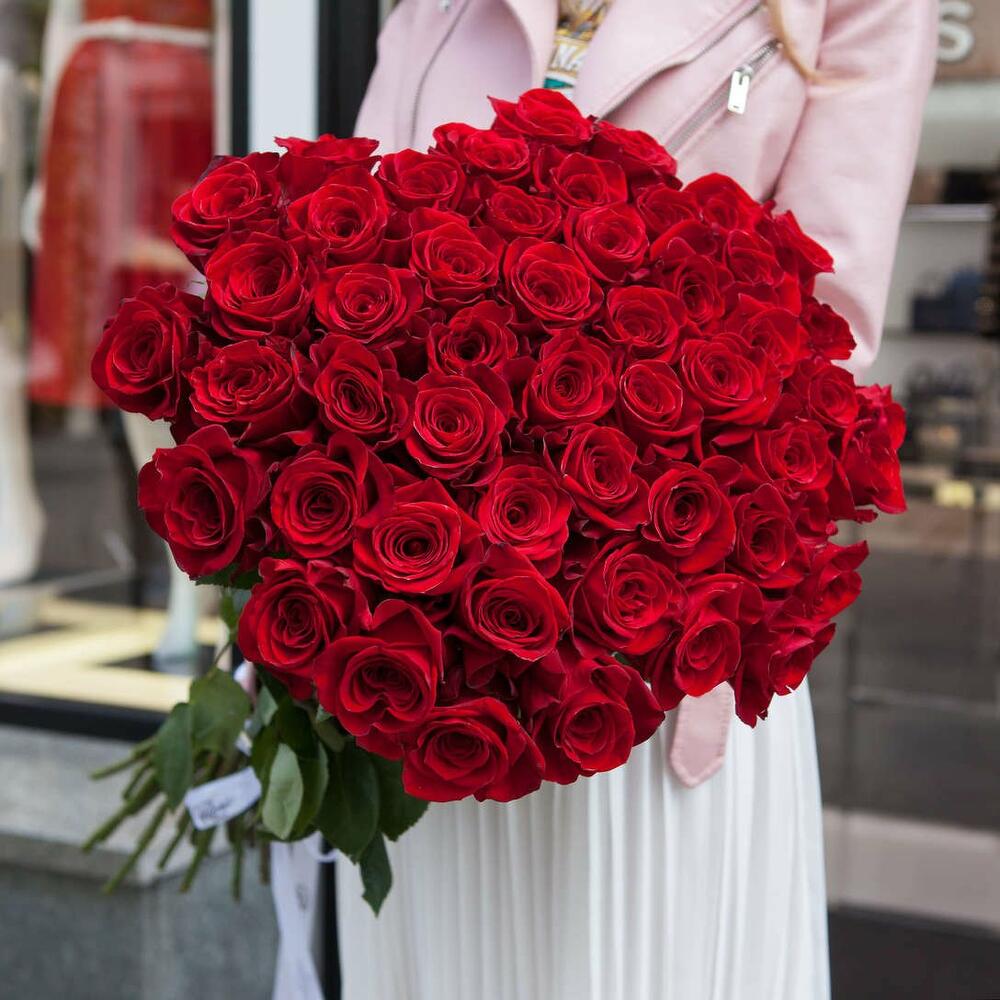 Атласная лента – 1 шт.Красная роза 70 см – 51 шт.