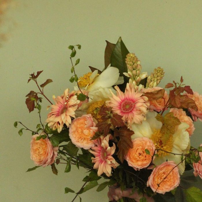 Лента – 1 шт.Пион – 3 шт.Роза кустовая пионовидная – 3 шт.тубироза – 2 шт.пузыреплодник – 3 шт.гербера кучерявая – 3 шт.зелень ветки – 3 шт.