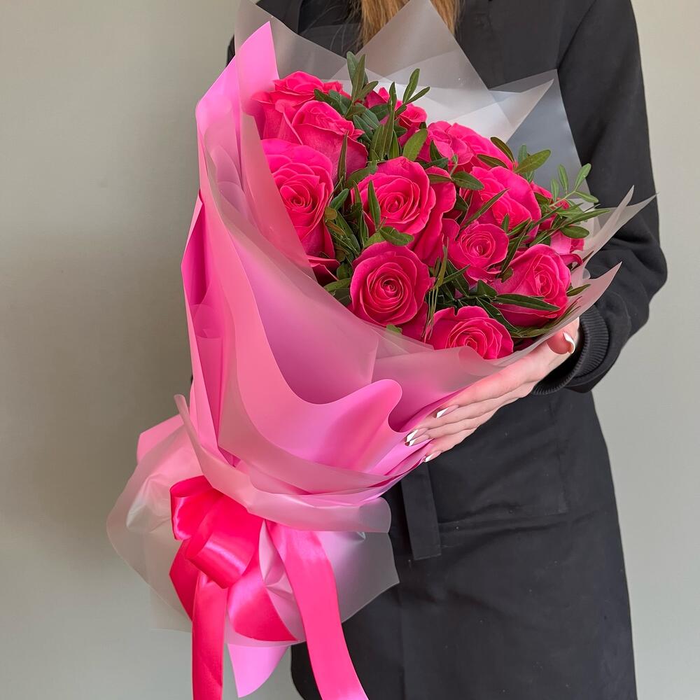 Роза Эквадор – 15 шт.Зелень – 1 шт.Упаковка дизайнерская – 1 шт.Лента атласная – 1 шт.