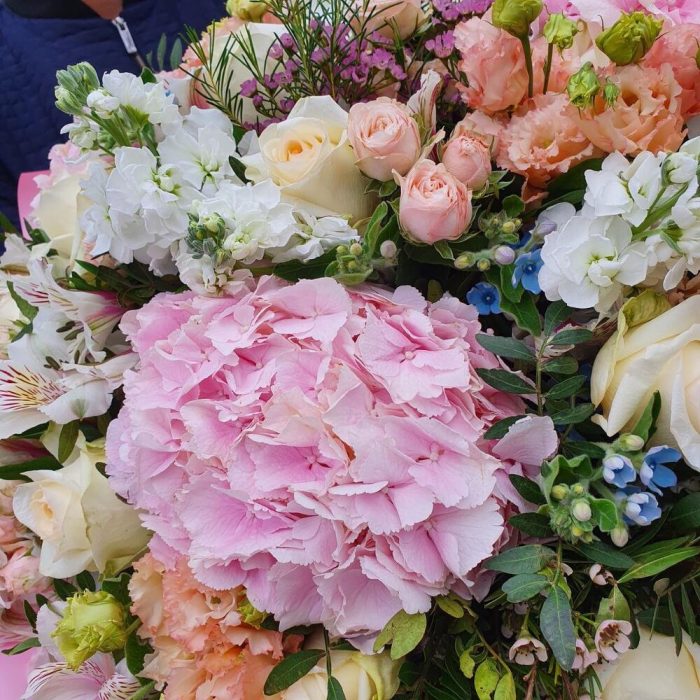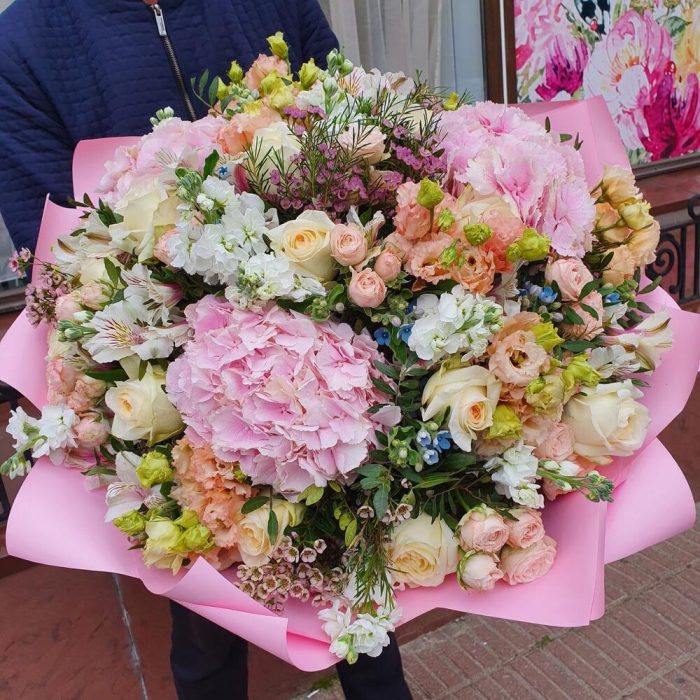 Гортензия розовая – 3 шт.Альстромерия – 10 шт.Маттиола – 10 шт.Лизиантус – 10 шт.Кустовая роза – 10 шт.Твидия – 12 шт.Роза Эквадор – 15 шт.Ваксфлауэр – 5 шт.Фисташка – 10 шт.Упаковка дизайнерская – 2 шт.