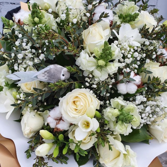 Гипсофила – 4 шт.Эвкалипт – 5 шт.Зелень – 25 шт.Роза белая – 19 шт.Фрезия белая – 10 шт.Упаковка дизайнерская – 5 шт.Львиный зев – 10 шт.Птичка декоративная – 1 шт.Хлопок натуральный – 5 шт.