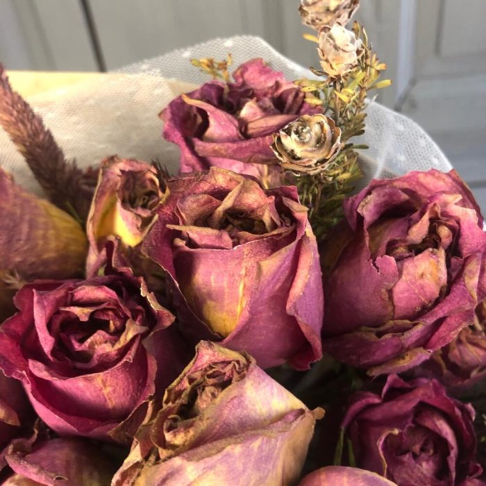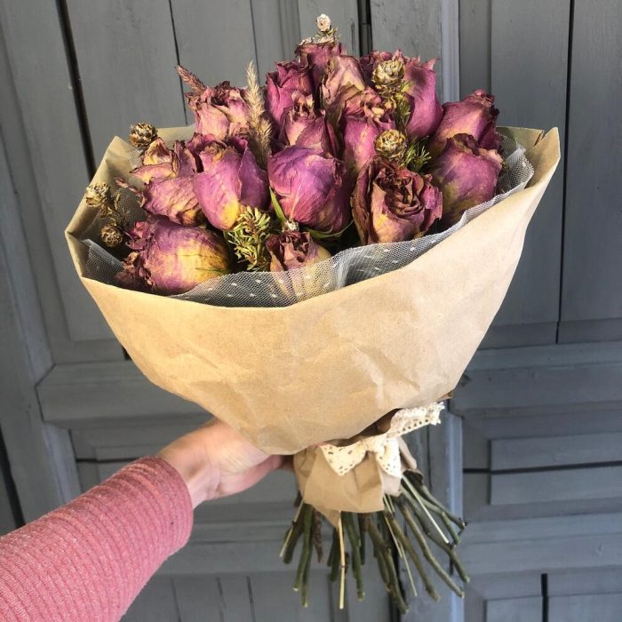 Роза сухоцвет – 29 шт.зелень экзотика – 3 шт.Упаковка дизайнерская – 2 шт.
