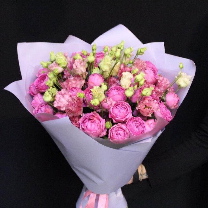 Лента атласная – 1 шт.эустома махровая – 11 шт.Пленка дизайнерская – 2 шт.роза кустовая пионовидная misty bubbles – 8 шт.