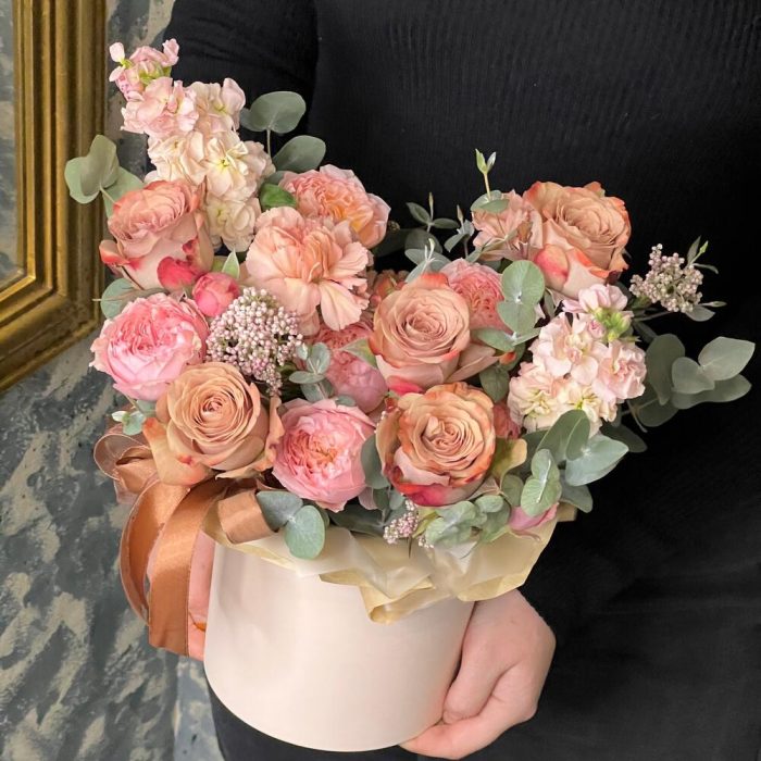 Роза Капучино – 5 шт.Маттиола – 2 шт.Роза кустовая пионовидная джульетта – 1 шт.Озотамнус – 2 шт.Диантус – 3 шт.Эвкалипт – 3 шт.Оазис флористический – 1 шт.бумага дизайнерская – 1 шт.Коробка шляпная – 1 шт.Лента атласная – 2 шт.