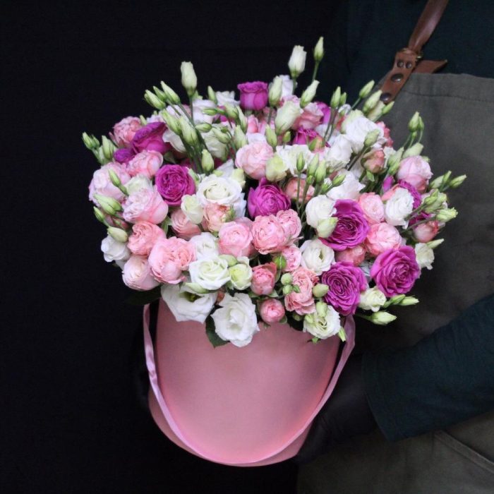 Роза кустовая пионовидная мадам бомбастик – 10 шт.роза кустовая пионовидная классик сенсейшн – 5 шт.Эустома – 10 шт.Оазис флористический – 1 шт.Шляпная коробка – 1 шт.