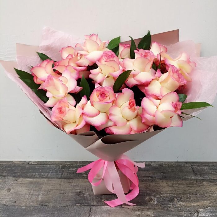 Рускус – 7 шт.Тишью – 3 шт.Упаковка дизайнерская – 3 шт.Роза Джумилия 50 см Россия – 15 шт.