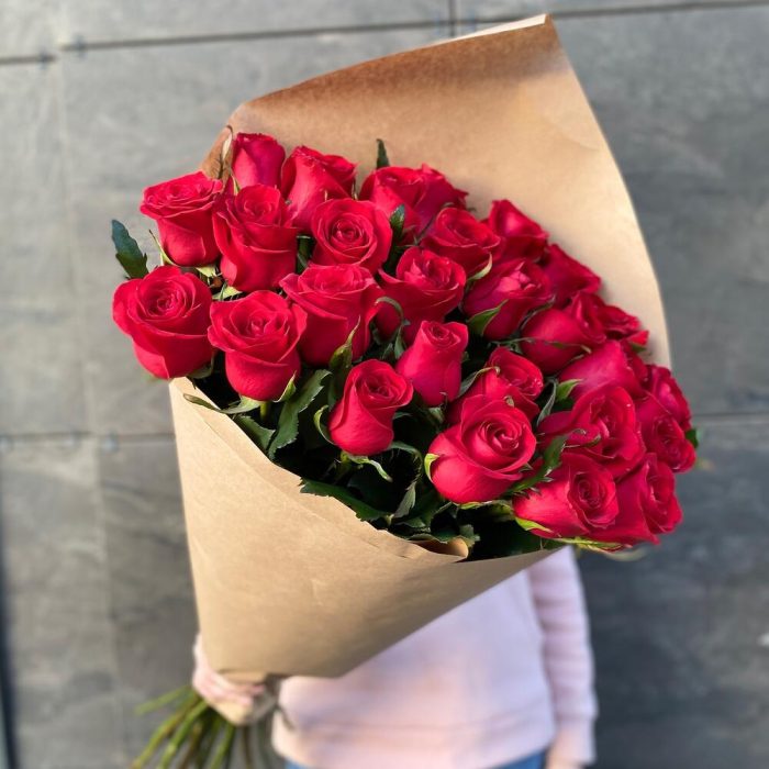 Лента атласная – 1 шт.Крафт упаковка – 1 шт.Роза красная 80 см – 27 шт.