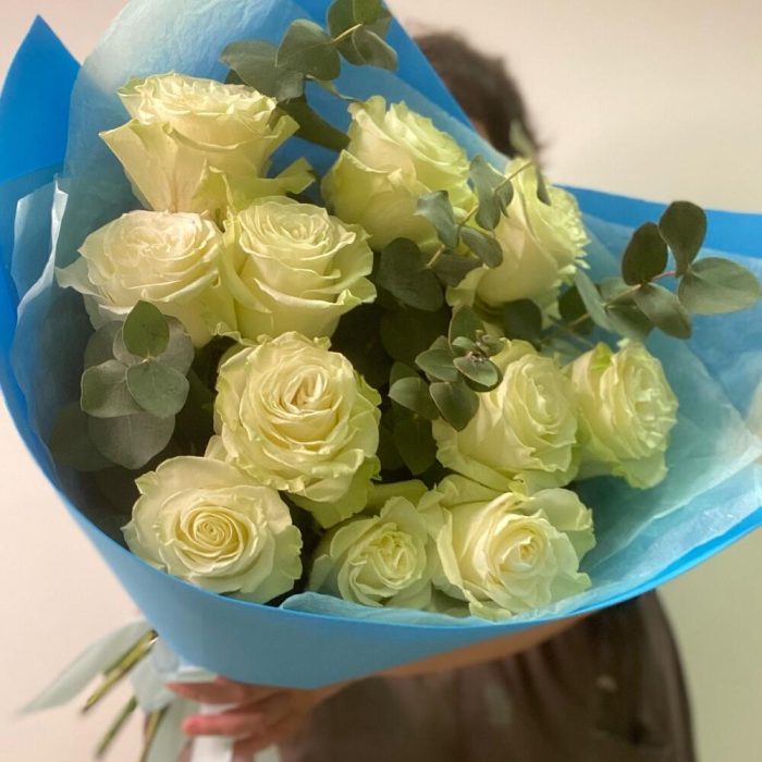 Букет из 11 белых роз и эвкалипта