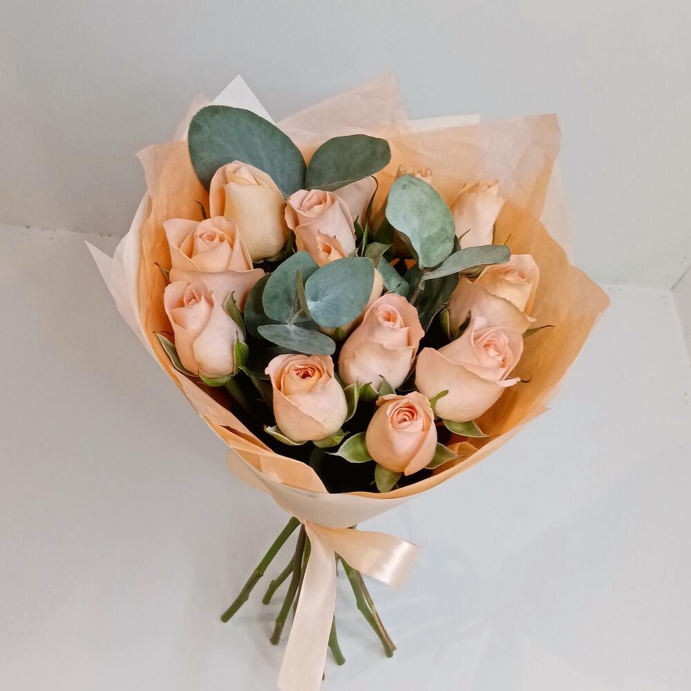 роза кения – 13 шт.Эвкалипт – 1 шт.Дизайнерская упаковка – 1 шт.