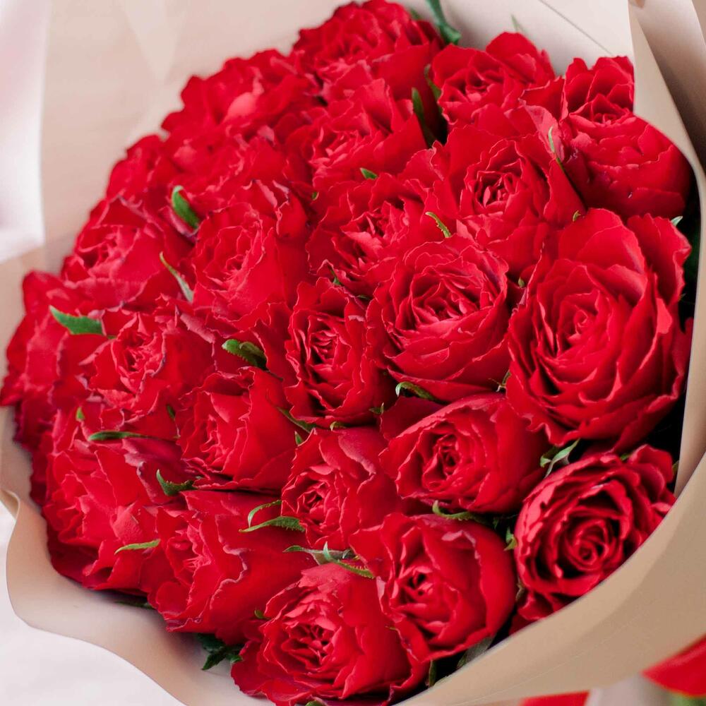 Букет из 25 красных роз (Кения) 40 см в кремовой пленке