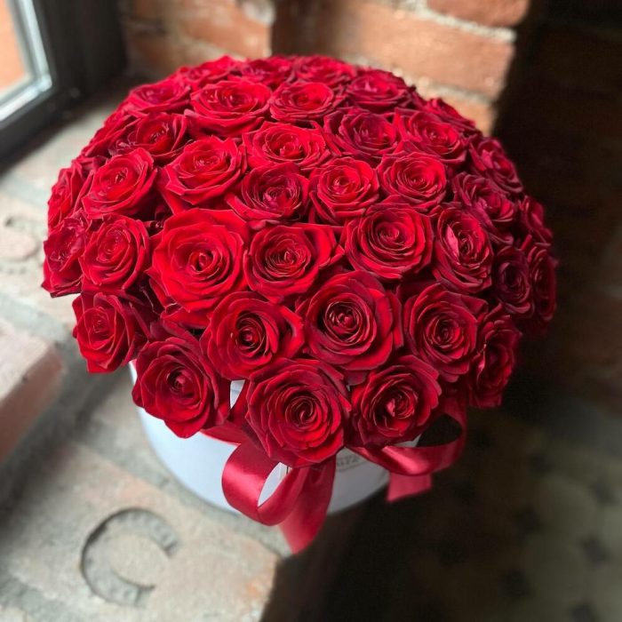 Букет из 51 красной розы в дизайнерской коробке “Роскошь красного”
