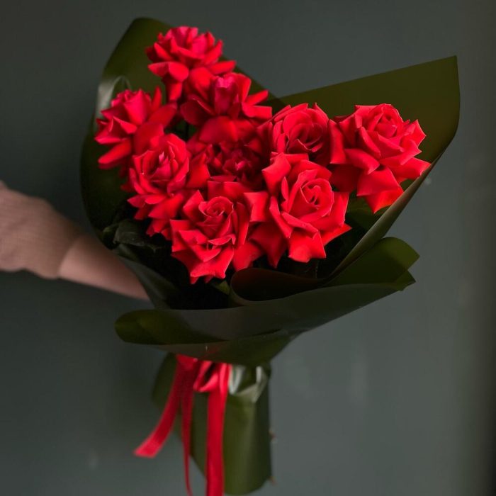 Роза красная – 9 шт.Авторская упаковка – 1 шт.уходовое средство для цветов – 1 шт.инструкция по уходу за цветами – 1 шт.Мини открытка – 1 шт.Аквабокс – 1 шт.транспортировочная упаковка – 1 шт.