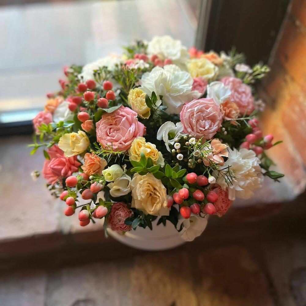 Роза кустовая – 15 шт.Гиперикум розовый – 7 шт.Гвоздика белая – 5 шт.Гвоздика кустовая желтая – 5 шт.Трахелиум – 5 шт.Хамелациум – 3 шт.Гвоздика розовая – 2 шт.Фисташка – 5 шт.Шляпная коробка – 1 шт.Оазис – 2 шт.