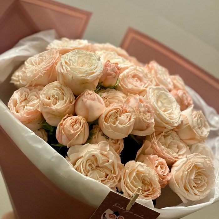 Лента атласная – 1 шт.Тишью – 1 шт.Роза кустовая пионовидная – 7 шт.Упаковка дизайнерская – 2 шт.