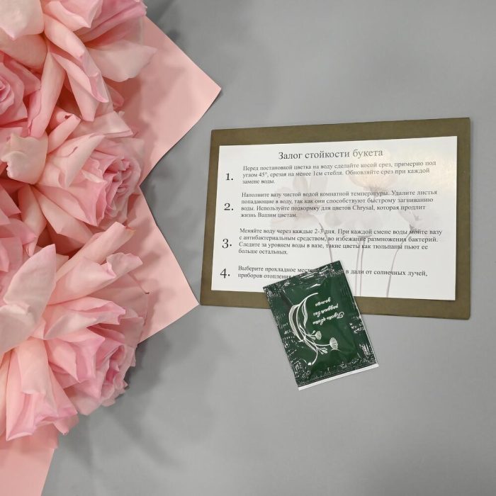 - Сроки возврата: Претензии по качеству букета принимаются в течение 24 часов с момента его получения.