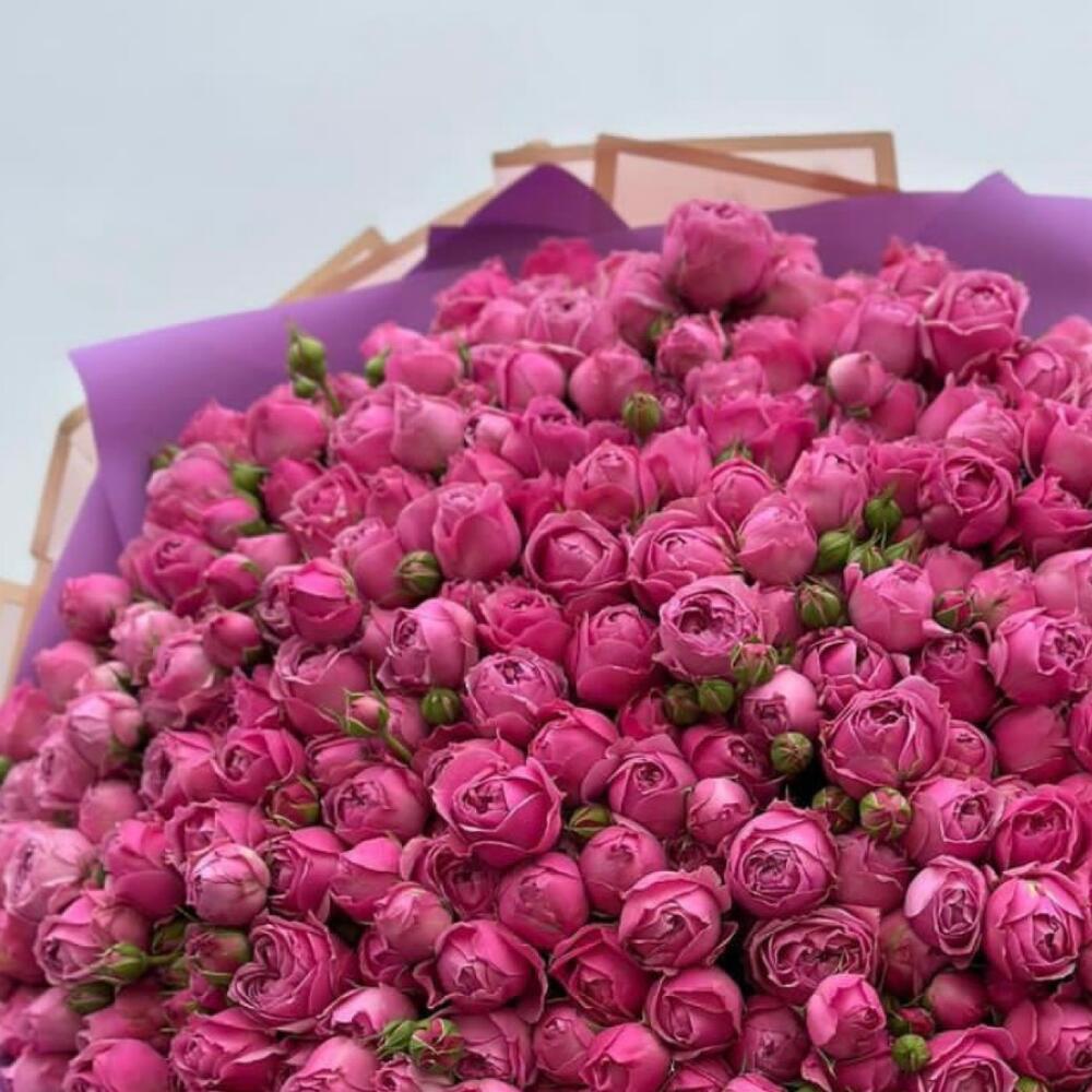 Роза кустовая пионовидная – 101 шт.Упаковка дизайнерская – 2 шт.Лента атласная – 2 шт.Открыточка с вашими пожеланиями – 1 шт.хорошее настроение – 100 шт.инструкция по уходу за цветами – 1 шт.коробка переноска – 1 шт.Кризал – 1 шт.